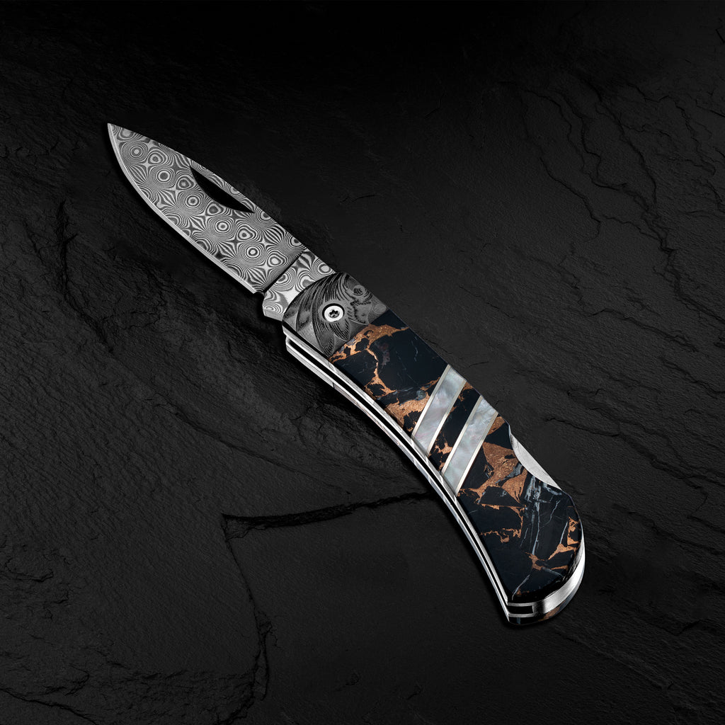 This Titanium Lockback is where high-performance steel meets timeless Southwest elegance. The blade is made from 110 layers of stainless Damascus, using Inox 690 and 440C for a beautiful Small Rose pattern and dependable daily performance. It’s CNC flat-ground and vacuum-treated to a Rockwell hardness of 59–60, making it strong, sharp, and incredibly refined.