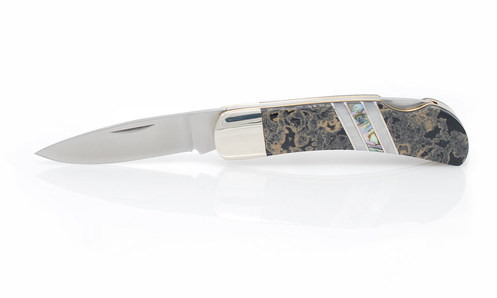 Natural Hot Springs from the North Sea that have built up mineral deposits over eons, then stabilized with various colors like Black, Blue, Red and Green. This beautiful natural occurring material is accented with Abalone and Mother of Pearl for a truly seaworthy knife handle.