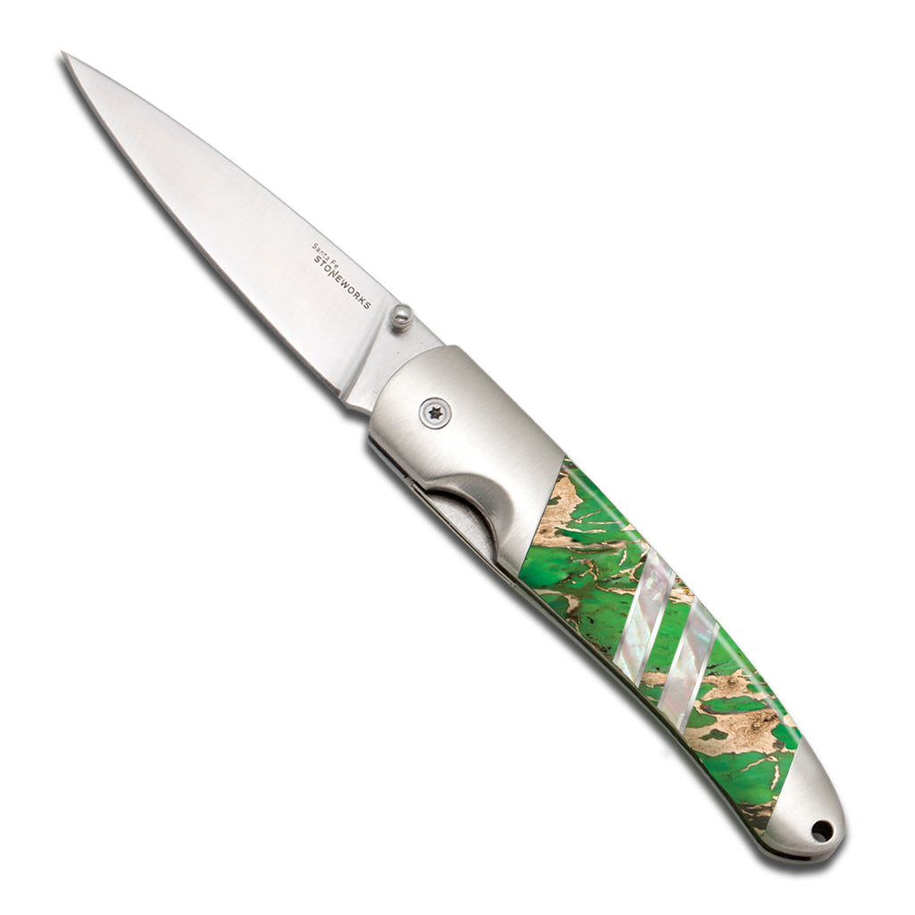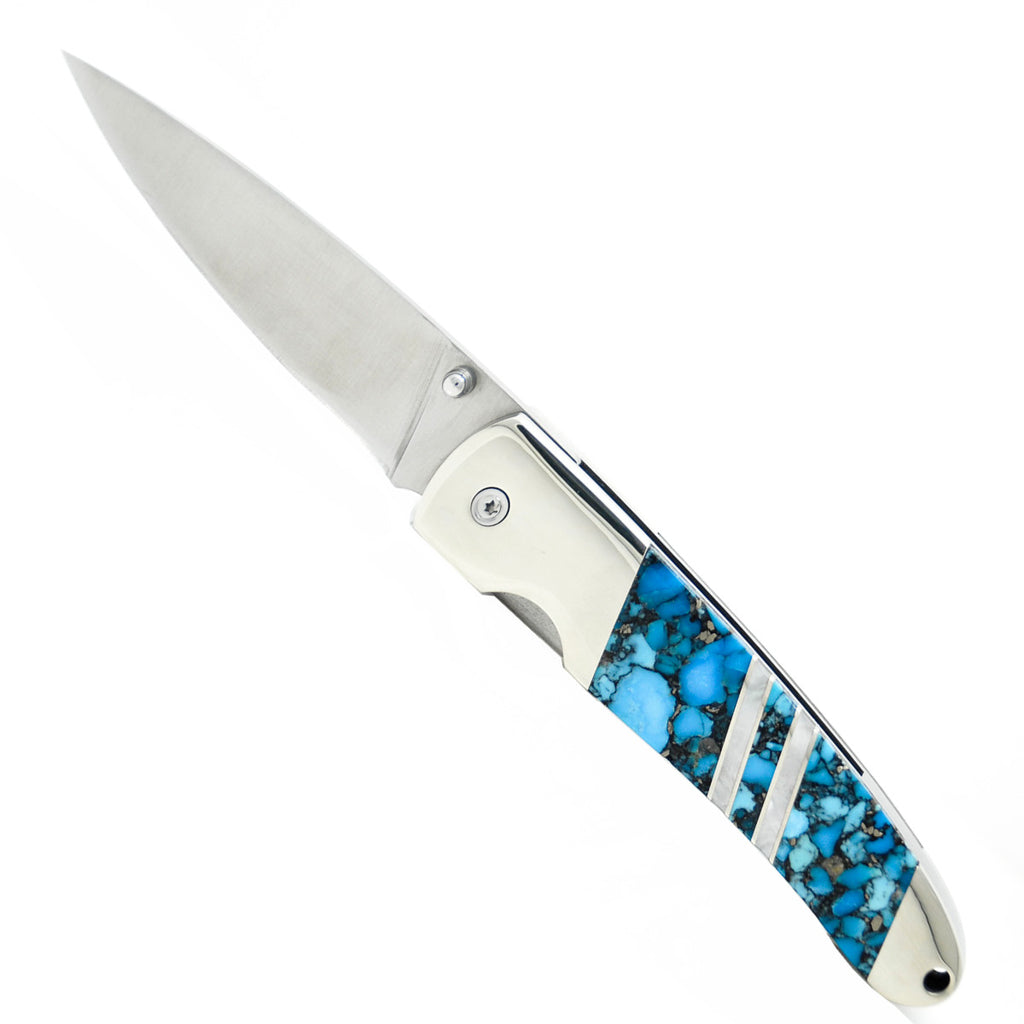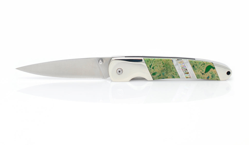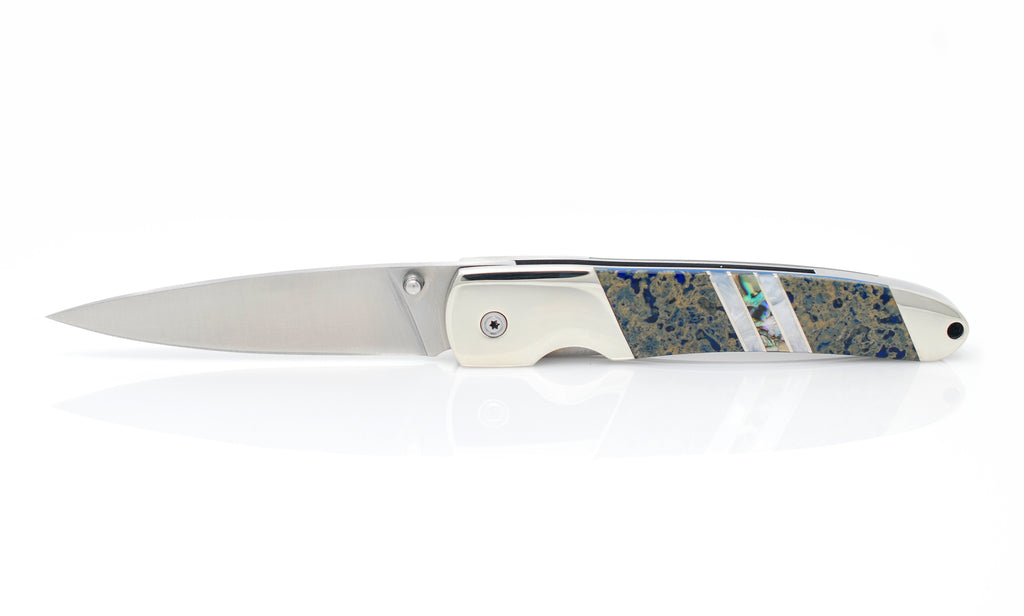 Natural Hot Springs from the North Sea that have built up mineral deposits over eons, then stabilized with various colors like Black, Blue, Red and Green. This beautiful natural occurring material is accented with Abalone and Mother of Pearl for a truly seaworthy knife handle.