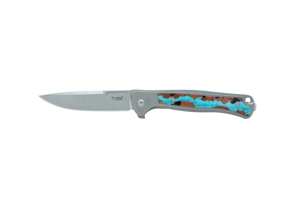This exclusive collaboration between Santa Fe Stoneworks and LionSteel blends Italian craftsmanship with the natural beauty of the American Southwest. Built on LionSteel’s ultra-slim Skinny platform with precision-machined titanium handles, this edition features an inlay of striking vein turquoise—known for its vibrant blue and green tones threaded with natural matrix patterns. The result is a refined fusion of high-performance design and timeless desert elegance, perfect for collectors and discerning everyday carry users.