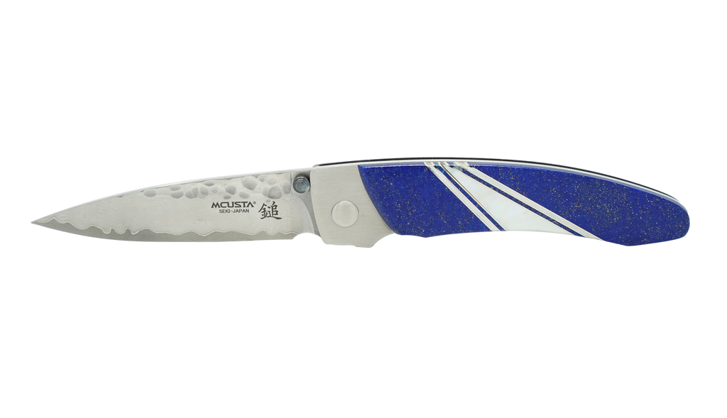 Mcusta MC-114D Forge Tsuchi VG-10 Core Damascus Blade Stainless Framelock 4.85" Folding knife with Lapis and Mother of Pearl