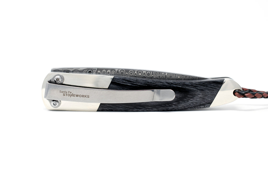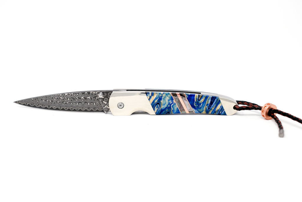 4" Liner Lock - Rain Drop Damascus - Fossilized Mammoth Molar "Blue" w/Copper and Black Lip Mother of Pearl Strips
