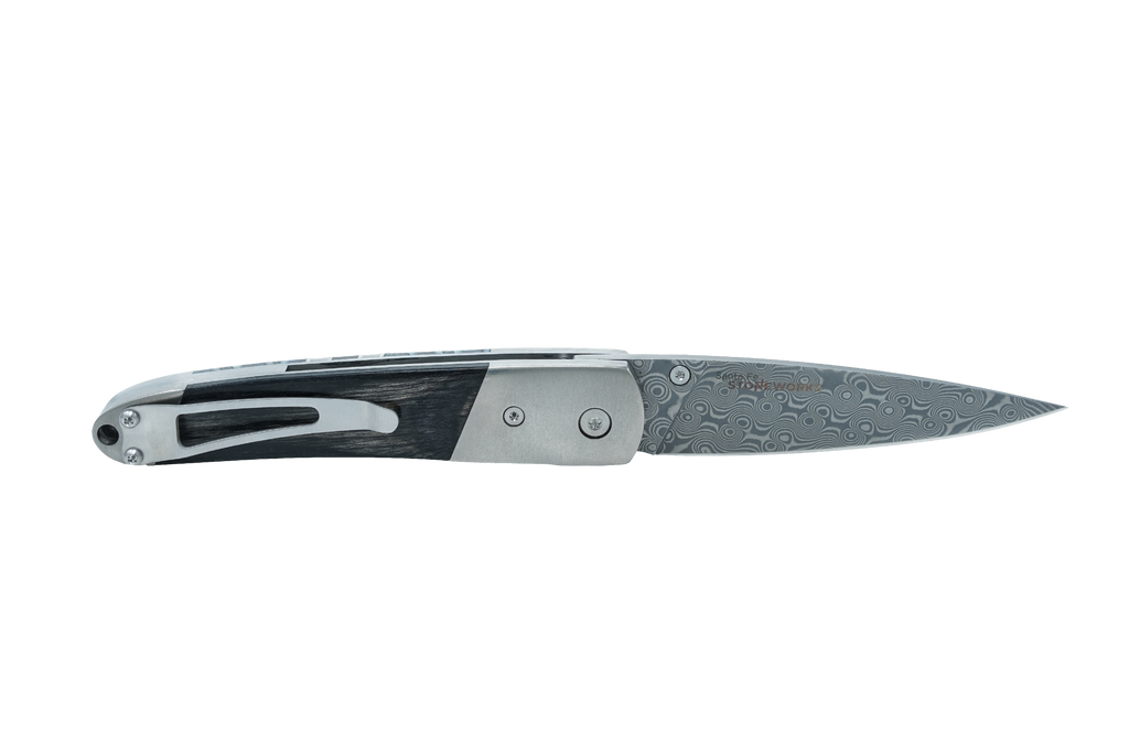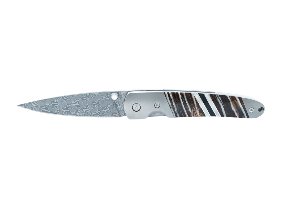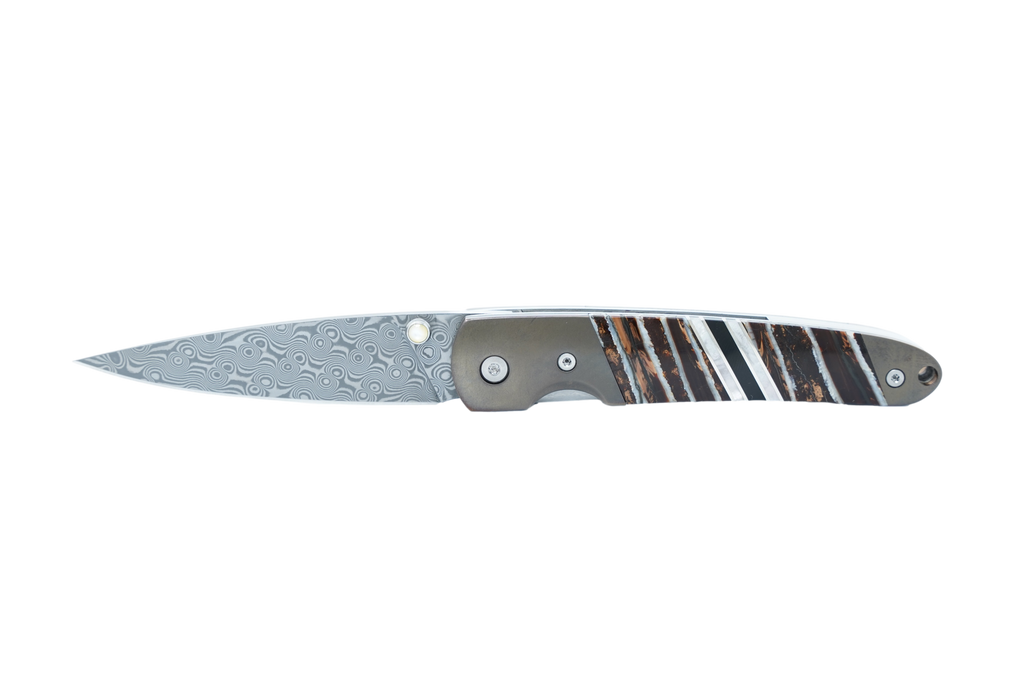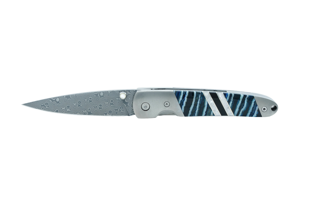 Handle Material- Mammoth Tooth "Dyed Blue" with Mother of Pearl and Jett Strips
