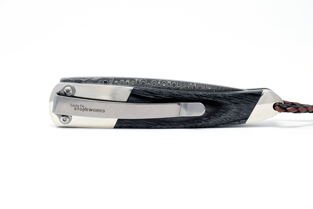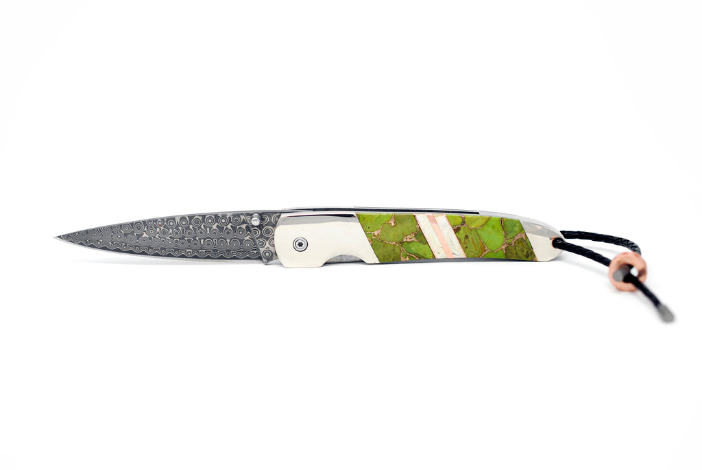 4" Liner Lock - Rain Drop Damascus - Mohave Green Turquoise Bronze w/ Copper and Gold Lip and Mother of Pearl Stripes