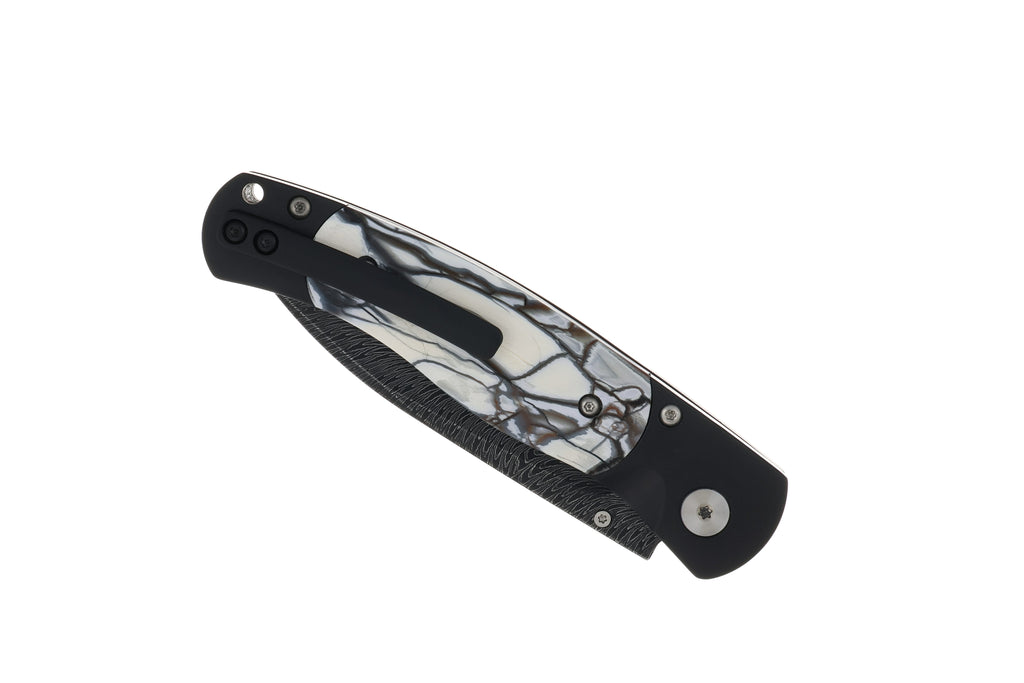 White mammoth tusk is preserved ivory from woolly mammoths that roamed the earth thousands of years ago. Discovered primarily in Arctic permafrost, the material displays natural grain structures that formed over millennia. When cut directionally, these organic patterns can mirror the flow of Damascus steel, creating a striking harmony between ancient fossil material and modern blade craftsmanship. Each piece carries a unique pattern, ensuring no two knives are ever exactly alike.