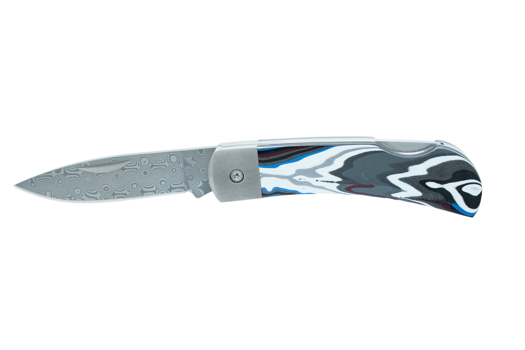 New-Titanium Bolsters and Stainless-Steel body with a 21/4" Damascus steel blade. This Damascus Steel is 110 Layers of stainless steel with a Rockwell hardness of 59-60 and vacuum heat treated. The two steel types that make up the Small Rose Pattern of the blade are 440C and N690 high alloy.
